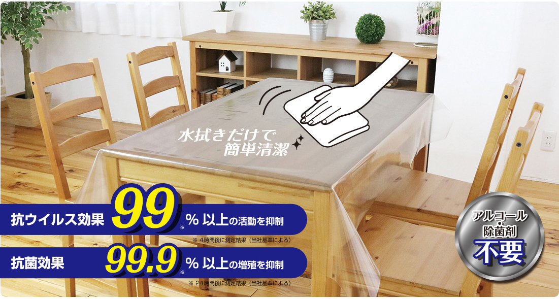 食卓をより安心・安全にする高性能透明シート。雑菌、バイ菌の増殖、ウィルスの活動を抑えます。ベタつき防止・静電気防止・防汚処理付き。